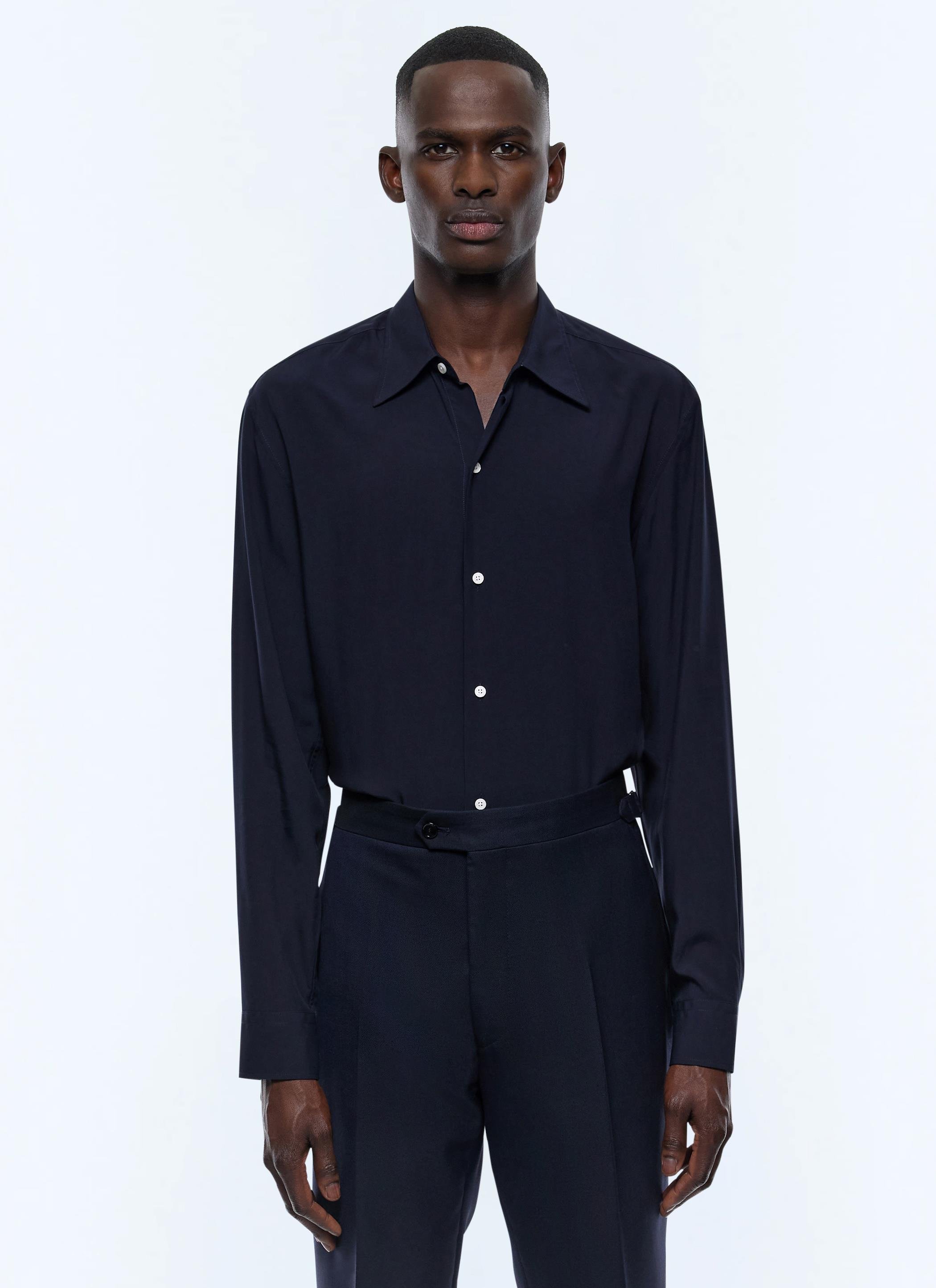 Sertifikalı ECOVERO™ viskozdan üretilen bu lacivert gömlek, kırlangıç yaka detayıyla akışkanlık ve modernliği bir araya getirir.