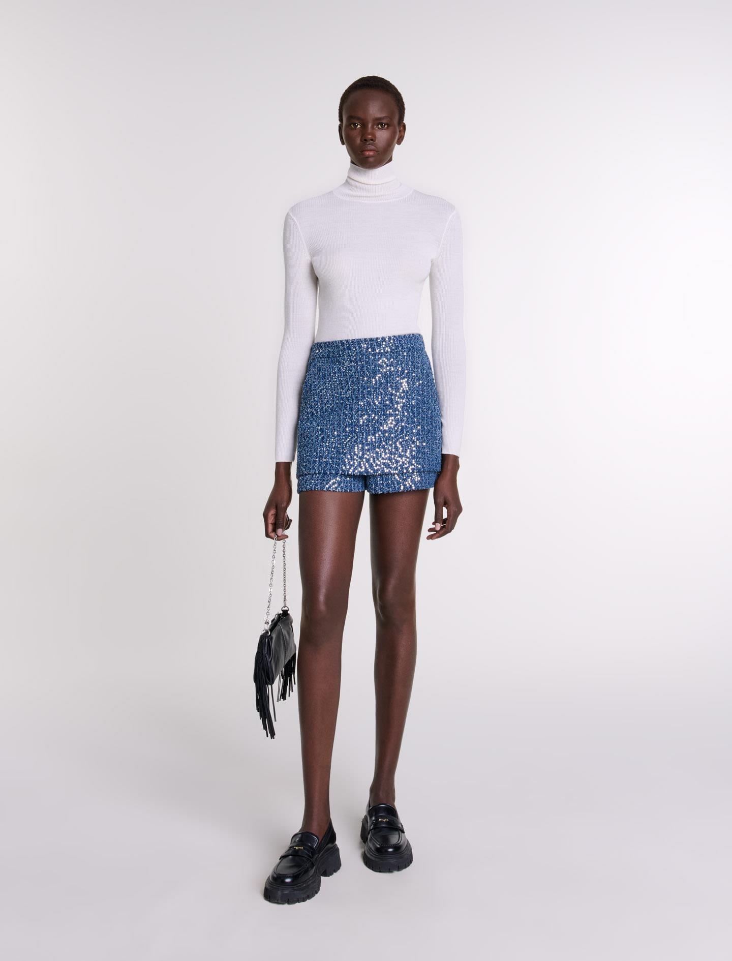 Çok yönlülüğe bir övgü niteliğindeki yeni Maje koleksiyonu, gün ve gece görünümlerini zahmetsizce kusursuz kılmak için rahat dokular ve zamansız renkler kullanıyor. Tüm yüzeyi payetlerle süslenen bu skort ile iddialı bir etki yaratın. Tüvit efektli denim kumaştan üretilen model, iki cebi ve arkası elastik bel formuyla silueti zarif bir şekilde vurguluyor. Sezonun öne çıkan parçalarından biri olan bu tasarım, triko bir kazak ve loafer ayakkabılarla kombinlenerek şık ve kendinden emin bir görünüm sunar.