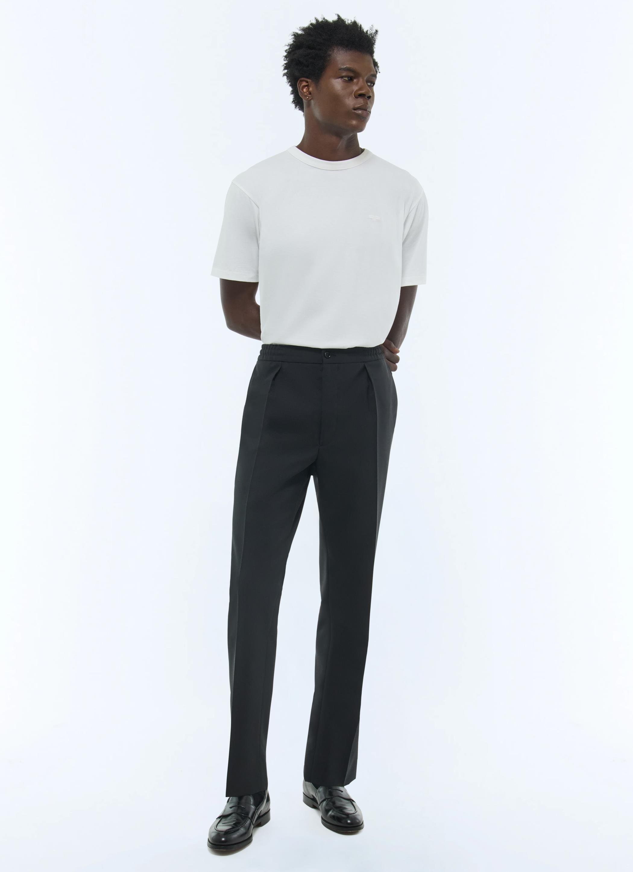 Sertifikalı saf yün kanvas kumaştan üretilen bu lacivert lastikli pantolon, konforu ve kusursuzluğu bir araya getirir. Ayarlanabilir beli, iç kısımda gizli bir bağcıkla rahat ama zarif bir siluet oluşturur.
